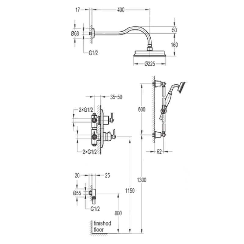 Liberty Concealed Thermostatic 2-outlet Shower Valve with Fixed Head and Slide Rail Kit