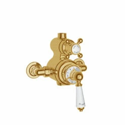 The St James Antique Gold Traditional Exposed Valve and Bath Filler is the ideal purchase to complete a classic, period shower. The beautiful porcelain and dials create a traditional feel. However the chrome finish allows this piece to fit in easily to a more modern bathroom setting. Furthermore all St James Showers are made in solid brass then hand polished to give you the highest quality product.